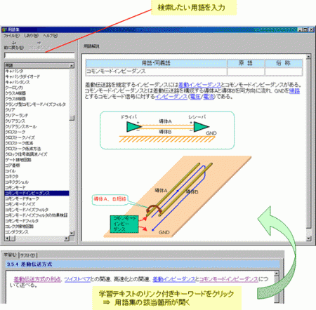 学習用テキスト本文中のリンク付きキーワードをクリックして、自動的に用語集を検索