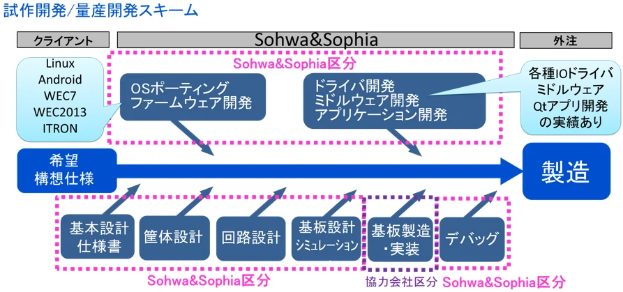 基板製造・実装以外は、自社で対応するため工程管理がスムーズ!ハード開発、OSポーティング、ドライバ開発etc、ハードからソフトまで一気通貫で受託できます。また、ハードのみドライバのみなどの部分請け受託も可能です。
