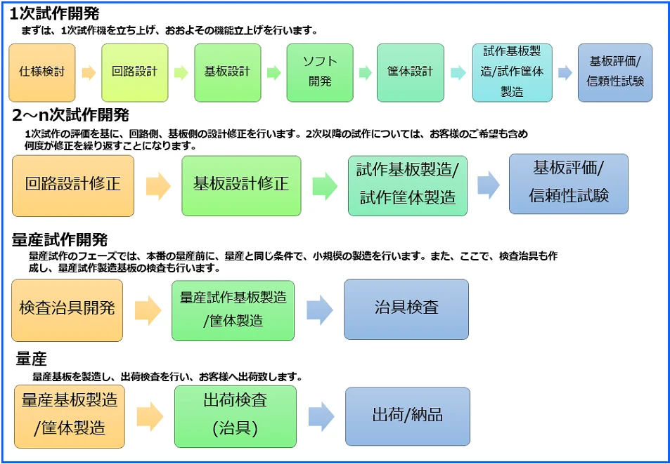 試作開発~量産試作開発~量産までの流れになります。